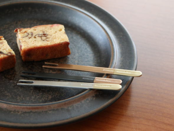 ステンレス製の小ぶりなフォークは和菓子の菓子切りにも使えるかたち。