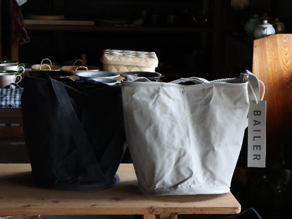 ベイラーバッグは、もともと船舶で使われていた消防用布バケツ淦汲(あかくみ)をリデザインした布バケツバッグ。
