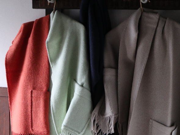 100%pure new wool、ラプアン・カンクリの織りの上質さで心地よさを感じてもらえます。羽織ったときのその軽さは冬物を