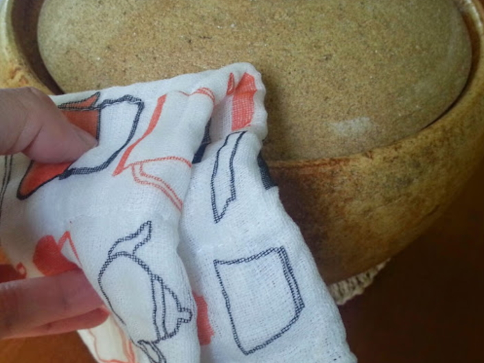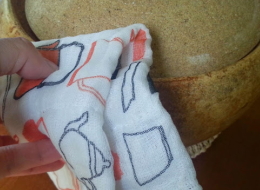 綿100%、表柄、裏晒の蚊帳生地を5枚重ねで縫い合わせた丈夫なふきんは、