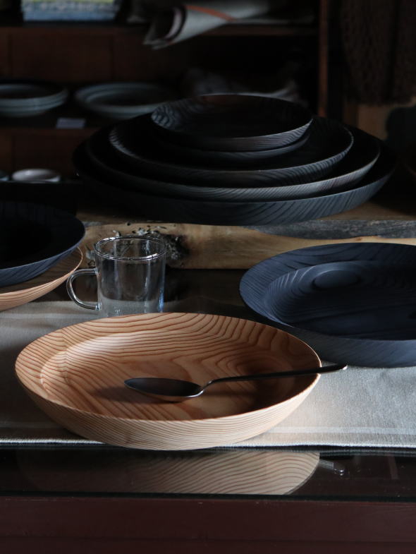 KACOMI 秋田杉で作られたプレート。ガラス塗装、柿渋と鉄媒染の黒い表情のタイプどちらもございます。 秋田県の中央に位置する五城目、その五城目の山から樹齢約60年の
